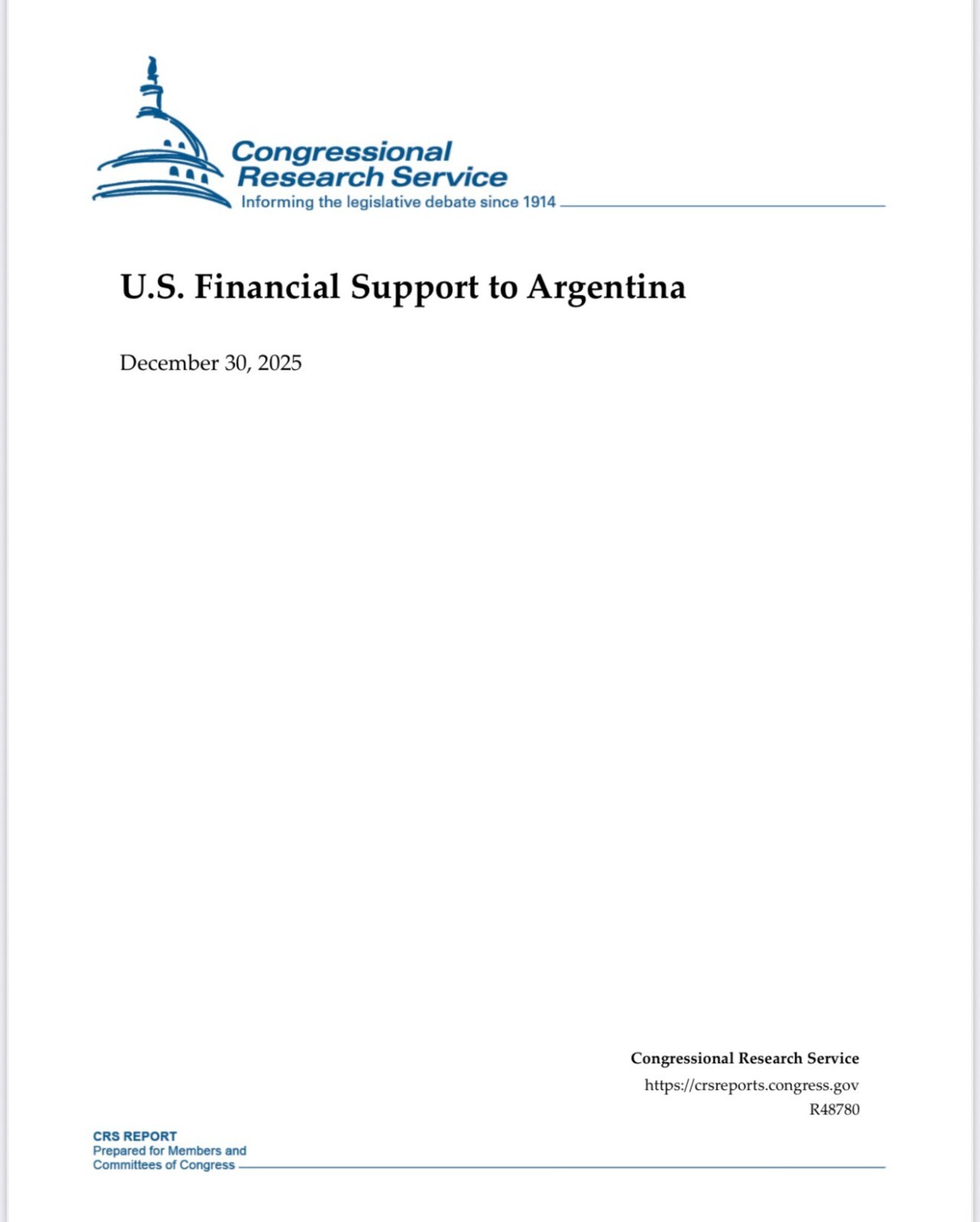 El documento fue elaborado por el Servicio de Investigación del Congreso (Congressional Research Service, CRS) —el organismo técnico que asesora a diputados y senadores estadounidenses— y lleva por título “U.S. Financial Support to Argentina”. El análisis, publicado el 30 de diciembre, examina en detalle la asistencia financiera brindada por la administración Trump a la Argentina y está dirigido a legisladores e integrantes de comisiones clave del Capitolio.