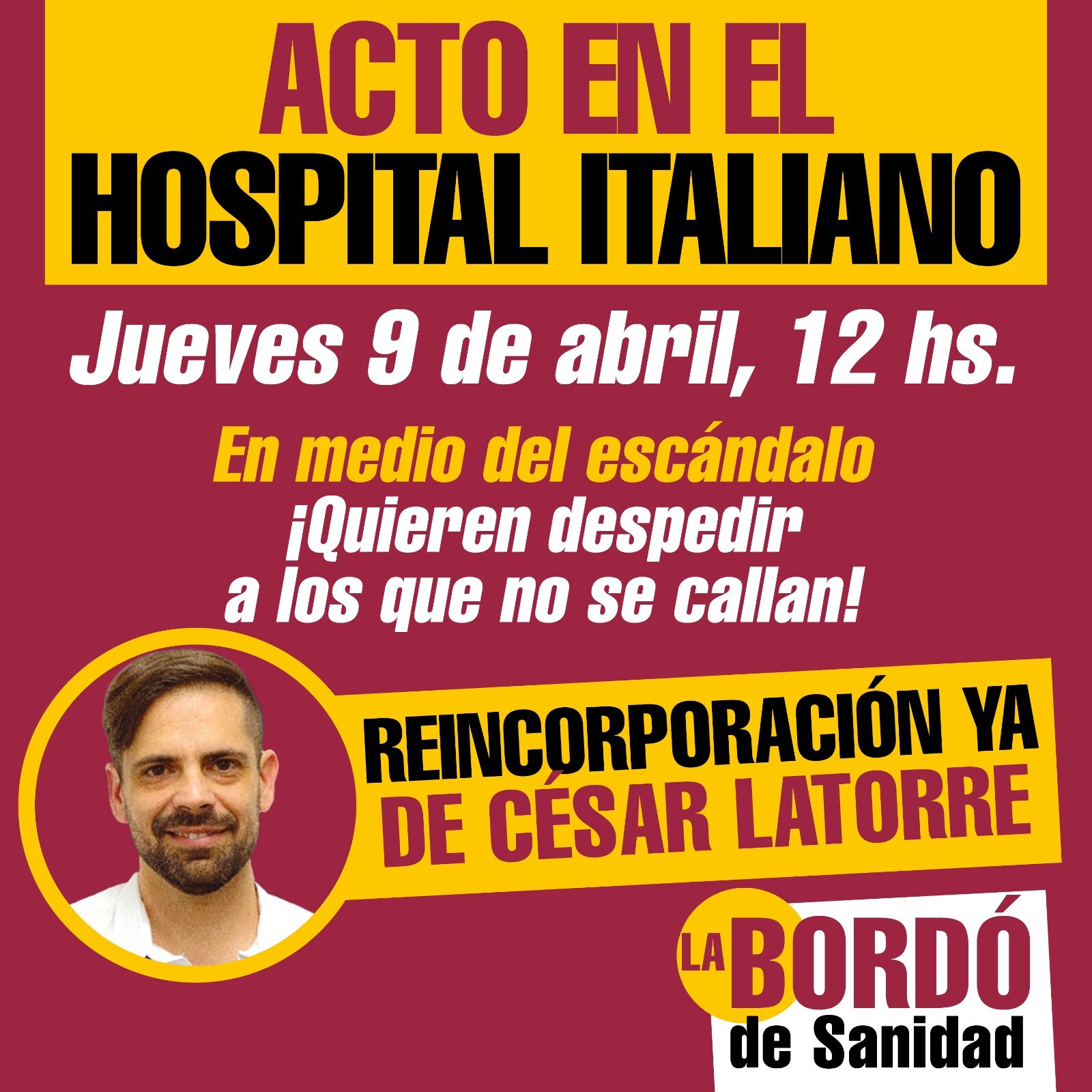 *Latorre* denunció: _“La semana pasada me comunicaron que me quieren despedir sin causa ni motivo alguno, después de más de 20 años de trabajo. Es evidente que buscan dar un mensaje a todo el personal: que agachemos la cabeza y no reclamemos. Están envalentonados por la Reforma Laboral, aunque hoy esté suspendida por la Justicia, y quieren avanzar contra las conquistas que hicimos durante años, cuando el Italiano fue un ejemplo en todo el gremio de la Sanidad. No lo vamos a permitir: exigimos mi reincorporación inmediata y vamos a impulsar medidas de lucha. Ya planteamos al sindicato y a la Comisión Interna la necesidad de enfrentar este despido en unidad. Este jueves 9 de abril a las 12 hs realizaremos un acto en las puertas del Hospital Italiano, y convocamos a trabajadores, pacientes y organizaciones solidarias. Sin los trabajadores que no se callan ni se venden, no hay Hospital Italiano”._